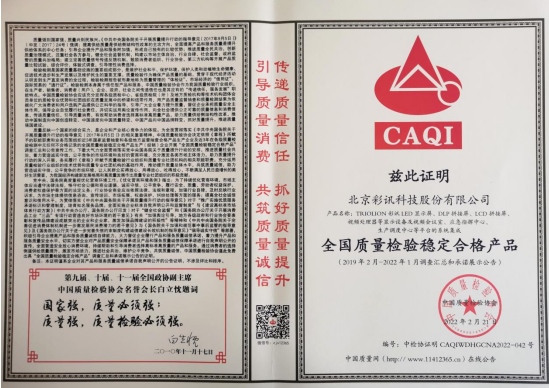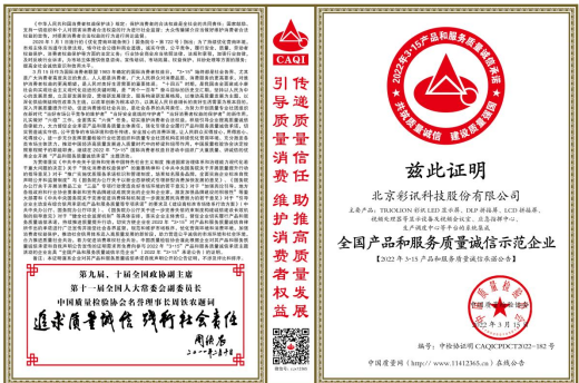 質量為先,誠信為重,在剛剛結束的由中國質量檢驗協(xié)會主辦的2022年全國”3.15質量月”活動中,彩訊科技榮獲”全國LED顯示行業(yè)質量領先企業(yè)” ”全國質量檢驗穩(wěn)定合格產品“ ”全國產品和服務質量誠信示范企業(yè)“3項殊榮。